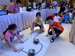 互动环节,小朋友们依次排队进行智能模型车的指定路线测试。“我的模型车走的好快啊”“让我把车子摆正后看看它是否按S型路线走”小朋友们蹲着地上,仔细观察模型车的行径路线,看见模型车出色的完成任务,个个都欣喜若狂。小朋友看着自己制作的机器人模型车通过编程进行行走,体验着成功的喜悦……