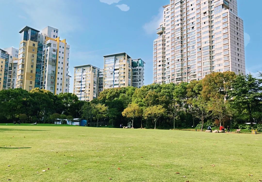 公园入口处的草坪犹如一片静谧的湖,小草随风摇曳,像一个个快乐的小精灵。