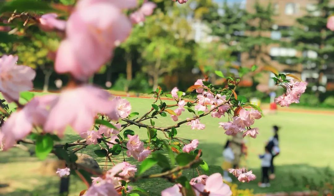 公园里的桃花、樱花眼下开得最欢实,淡淡幽香,芬芳扑鼻,使人陶醉其中。三三两两的孩子在草地上撒欢儿奔跑,朝气蓬勃。