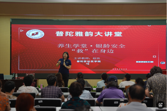 9月24日下午13:30,“普陀雅韵大讲堂”系列讲座之秋季第三场——“养生学堂·银龄安全‘救’在身边”主题讲座,在普陀区社区学院匠?星阁准时开讲。活动当天,众多银发学员提前抵达现场排队签到,脸上满是期待,现场氛围热烈而温馨。