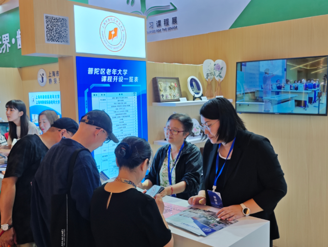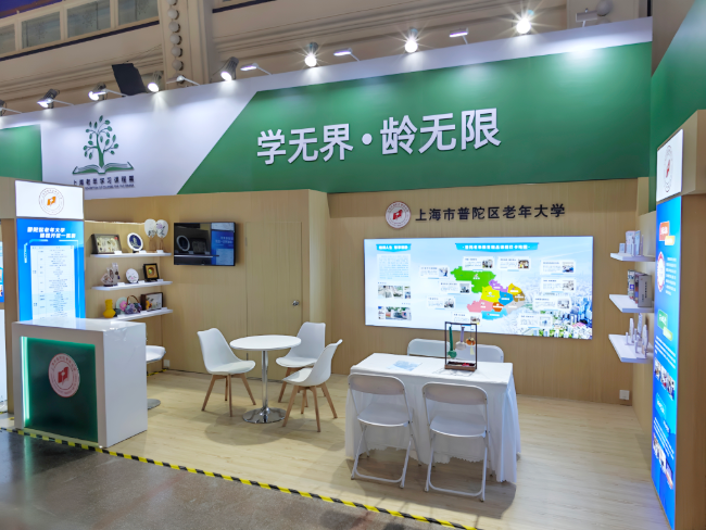 普陀区老年大学展台位于学习成果展示区,设计风格融人文温度与科技理性于一体。展台以“普陀老年教育精品课程打卡地图”为主线,从“多维课程·潮引银龄”“灵动课堂·智趣飞扬”“活力绽放·风采同行”等角度,全方位展现近年来学校坚持适需与引领结合、普惠与特色并举,积极构建“1 10 X”区域老年教育办学格局,不断加强数智赋能发展、健全新质多元课程体系的生动实践和可喜成效。