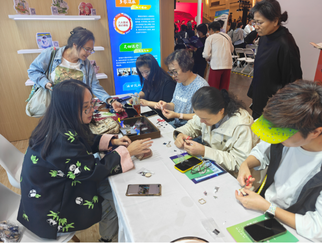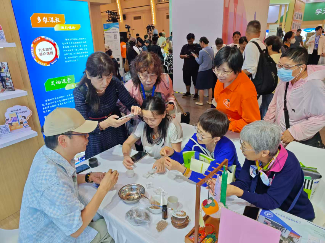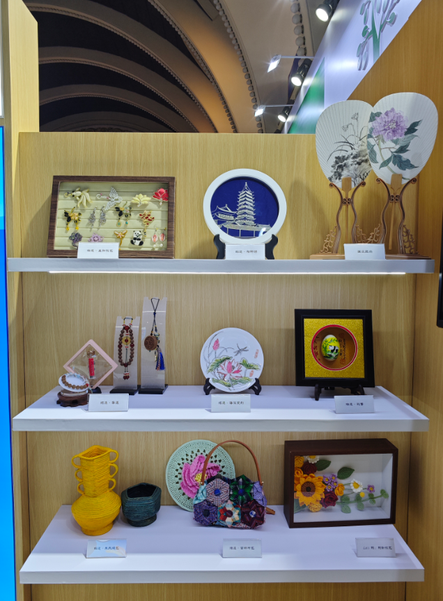 展台内,通过九宫格的形式陈列了“秸秆绣”“朱氏绳艺”“海派瓷刻”等非遗手工类课程作品,区域特色鲜明,吸引众多老年观众驻足欣赏。