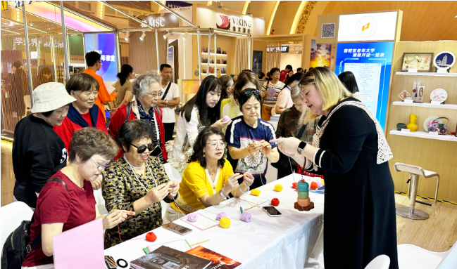 展会期间,老年大学教师和各街镇非遗传承人轮番带来精彩纷呈的现场展示活动,并邀请观众一同参与体验。互动体验课程区人头攒动,观众在主讲教师的指导下冲泡八宝茶、特调咖啡,制作香珠、针绣、绳艺、布艺作品,感受普陀老年教育“雅智相融”的独特魅力。