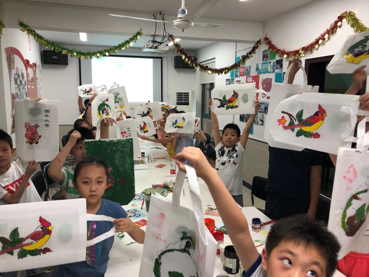 最后大家高高举起心爱的作品,合影展示!这个夏天手提个性环保袋,自我创作、重复利用,垃圾分类成为夏天又一新时尚!