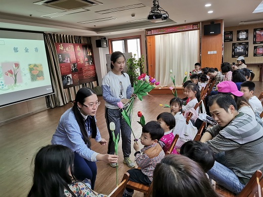 为了更参加活动的亲子家庭能更加直观也更加融入活动中,图书馆老师事先准备好了人造郁金香,虽然是假花,但果然是引起了小朋友们极大的兴趣。